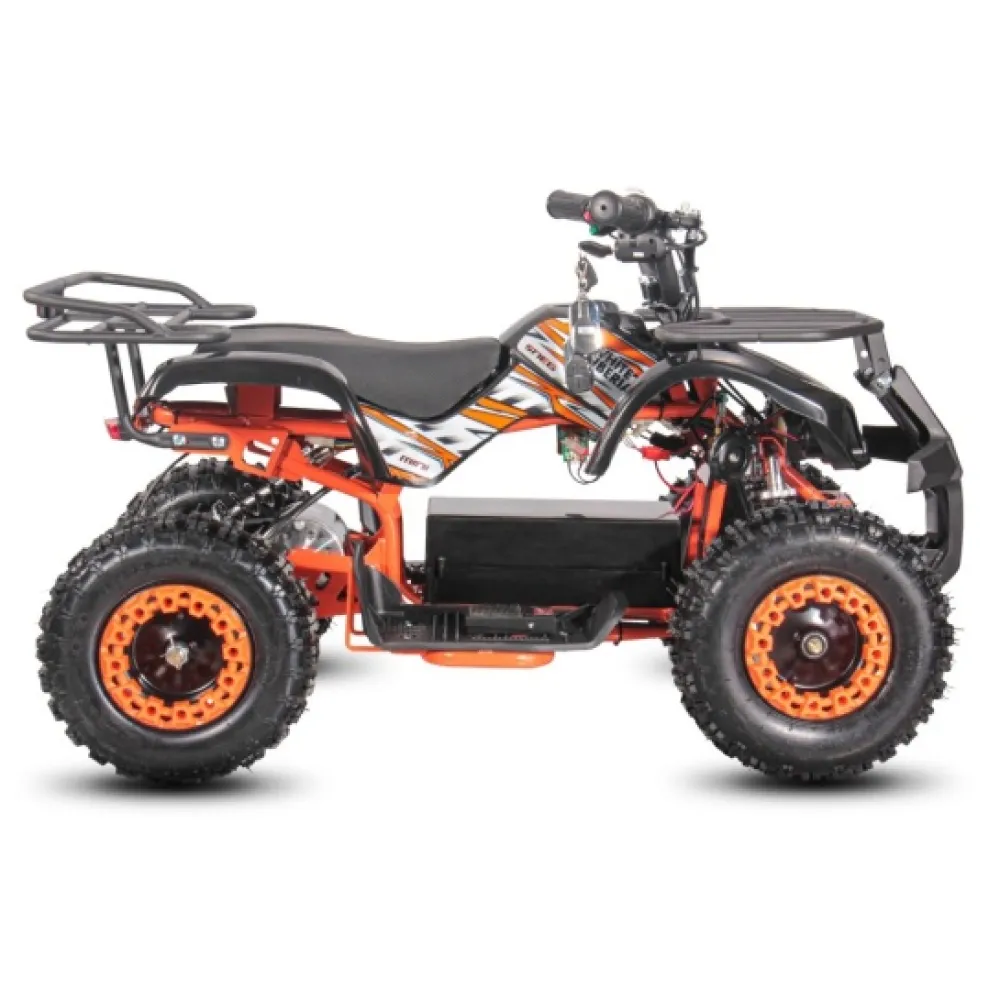 Запаса заряда АКБ хвати на преодоление 25 км пути без подзарядки. Фирменные амортизаторы обеспечивают плавную езду по любому типу дорожного рельефа. Электроквадроцикл оснащен большой светодиодной фарой, разрешающей езду и развлечение подрастающего водителя в вечернее время и непогоду.