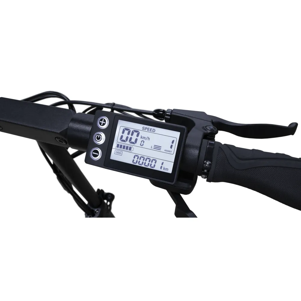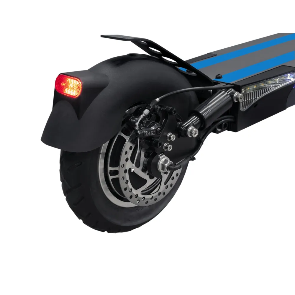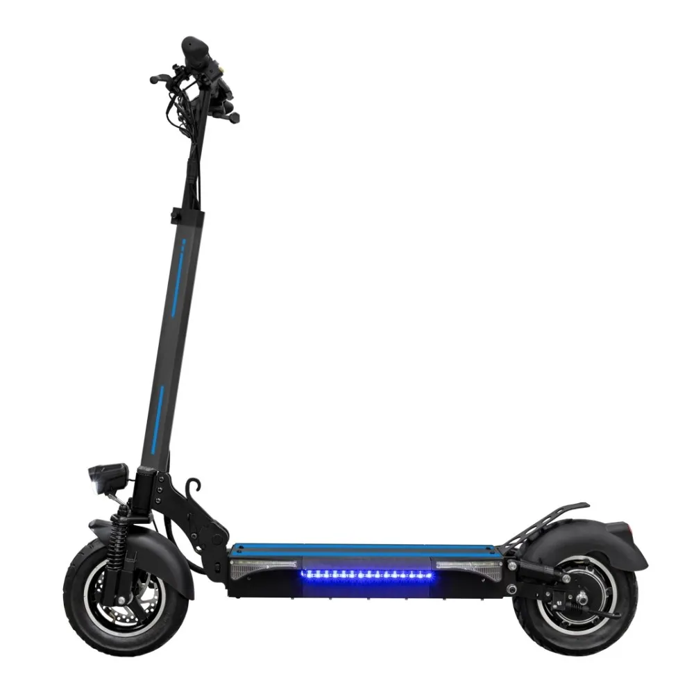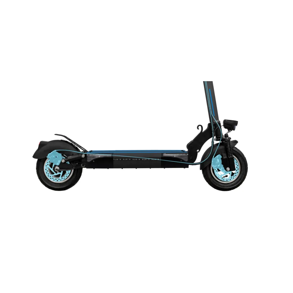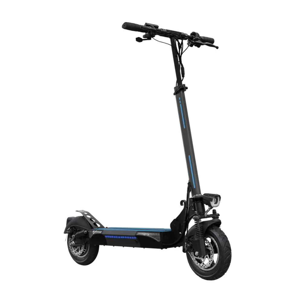 Самокат обладает привлекательным стильным дизайном, который идеально дополняет декоративная синяя подсветка деки. Самокат весит 22 килограмма и способен складываться для удобной транспортировки. Есть возможность настроить высоту руля. Также самокат оснащён бортовым компьютером, дисплей которого имеет функцию подсветки. С его помощью вы всегда можете узнать о пройденном расстоянии, скорости перемещения, статусе заряда батареи и др.