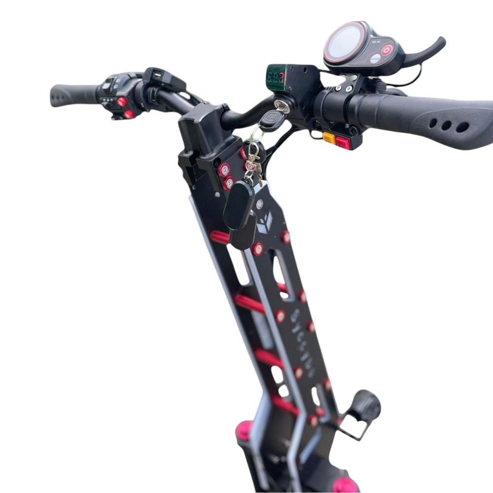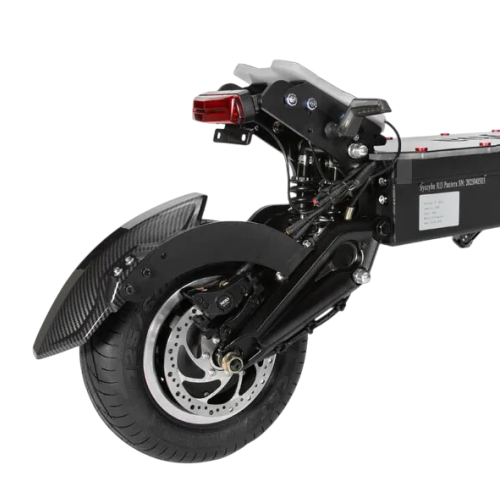 Электросамокат Syccyba Goliaf — полноприводный внедорожник премиум-класса с пиковой мощностью 11000 Вт, максимальной скоростью 110 км/ч, пробегом до 100 км и грузоподъемностью до 150 кг, предназначенный для экстремальной езды по бездорожью.
