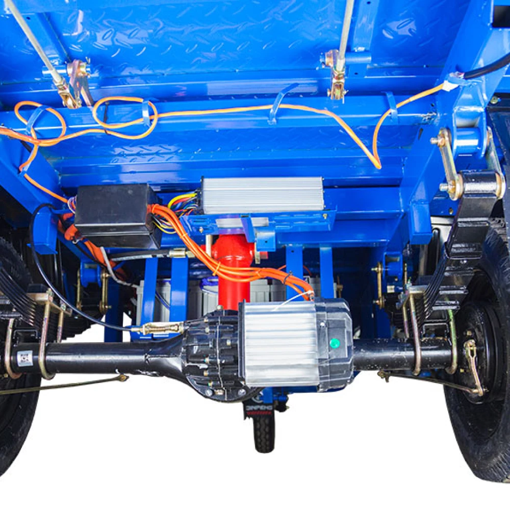 Этот электротрицикл оснащен гидравлическим приводом, что обеспечивает плавное и стабильное управление. Передняя подвеска состоит из усиленных гидравлических амортизаторов, которые обеспечивают комфортную езду даже на неровных поверхностях.