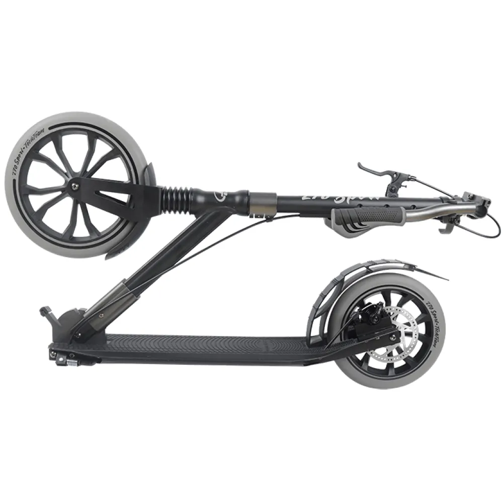 Рулевая часть широкая – 52 см. Возможна фиксация в трех положениях (100-115 см). Система складывания – стандартная. Тормозная система – ручная дисковая и задняя ножная. Дека – широкая, рабочая поверхность – большая, допускает установку двух ног одновременно. Материал покрытия – прорезиненный, износостойкий. В качестве комплектации к самокату прилагается ремень для переноски.